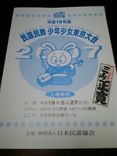 dcaeaf7c.jpg明日、5月27日に日本民謡協会が主催します15歳までの民謡民舞少年少女大会が品川大井町の日本民謡会館ホールで催されます。