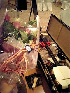 サプライズで演奏終了後に花束をいただき、楽屋に戻り楽器にも「お疲れさま!」と花束と並べてみました(^o^)