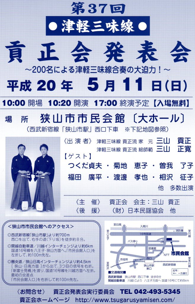 津軽三味線奏者三山貢正 ・二代目 三山貢正&貢正会関連の舞台演奏活動報告や皆さんとの情報広場ですo(^-^)o舞台・ステージでの演奏活動情報…津軽三味線・民謡のお稽古…テレビ・ラジオ出演情報…レコーディング…日常のひとコマ…お知らせ etc