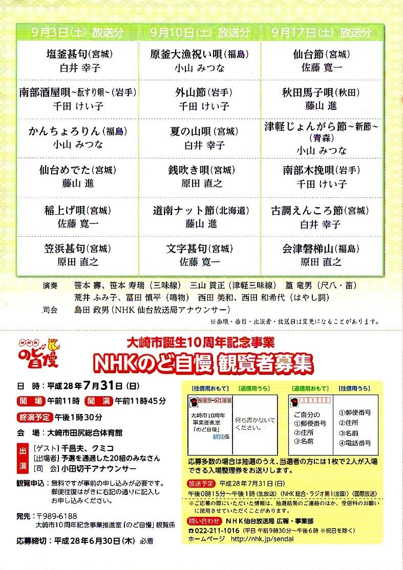 omoteuramen先週末に宗家が宮城県大河原町(仙南芸術文化センター)でNHKのラジオ放送番組「民謡をたずねて」の収録をして参りました♪