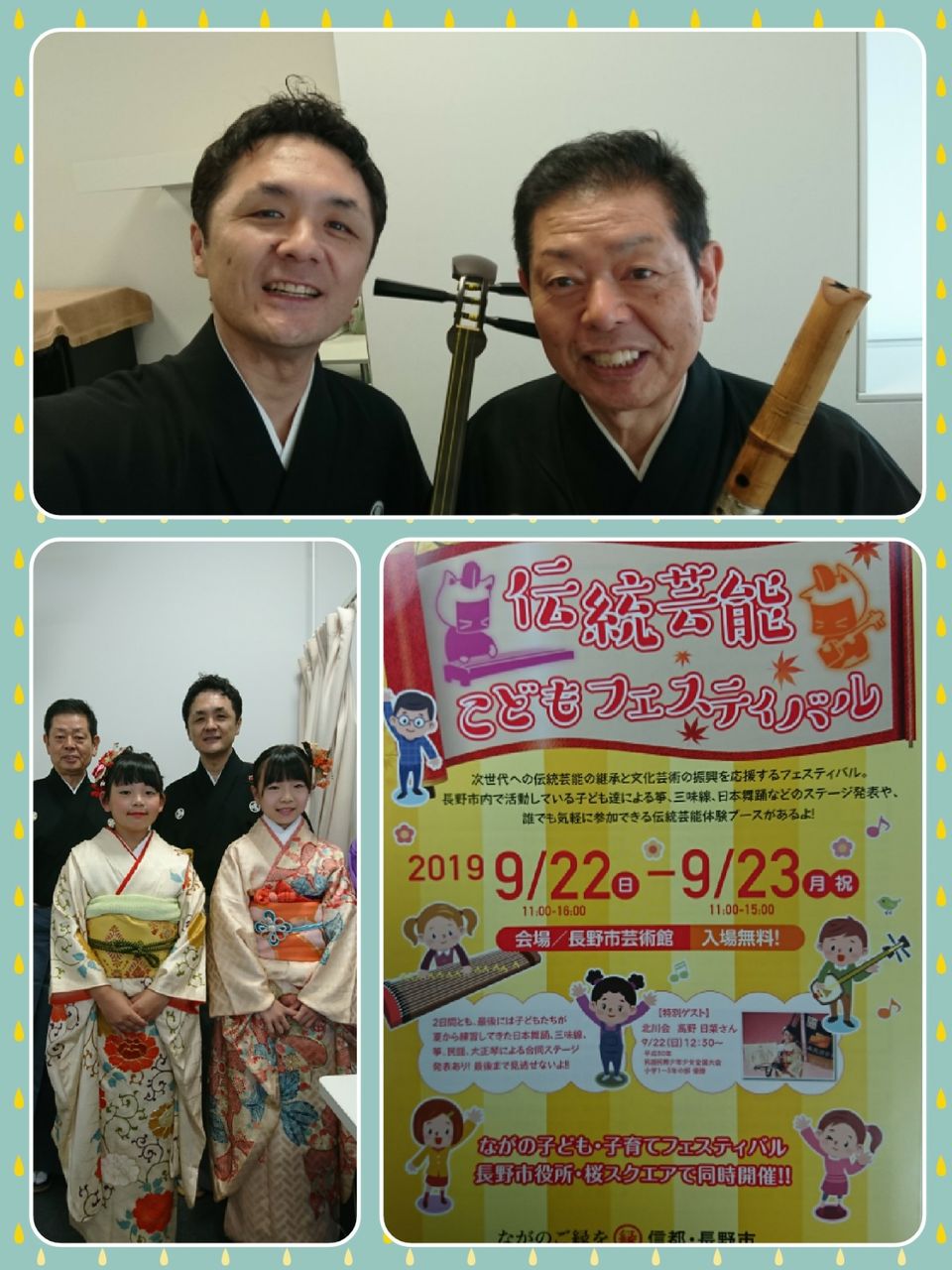 collage-1569135837281今日は長野市の『伝統芸能こどもフェスティバル』の特別ゲストとして昨年の少年少女全国大会(小1〜小3)優勝者の三味線伴奏として公益財団法人日本民謡協会の派遣で尺八の鈴木錦風さんと行って来ました♪