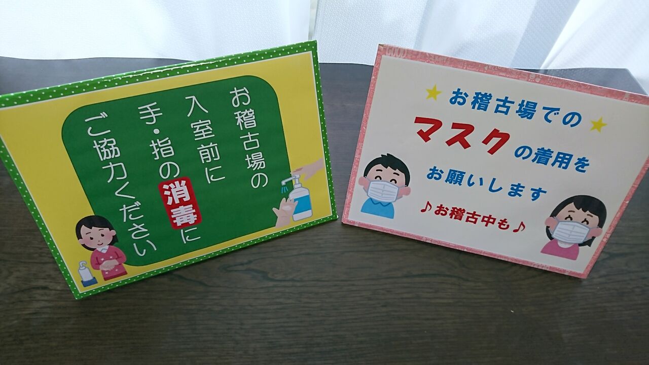 1. 玄関入口に「消毒液」を設置致します。 お稽古場に入室される前に手指の消毒を必ずお願い致します。