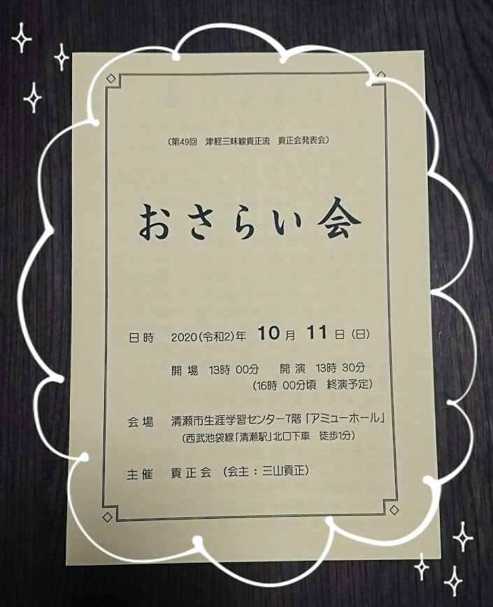 新型コロナウイルス感染症の流行に伴いまして4月の開催を断念しました貢正会発表会でしたが、規模を縮小し出演者以外「無観客」などの感染症防止対策を行いまして去る10月11日(日)に「おさらい会」を開催致しました。