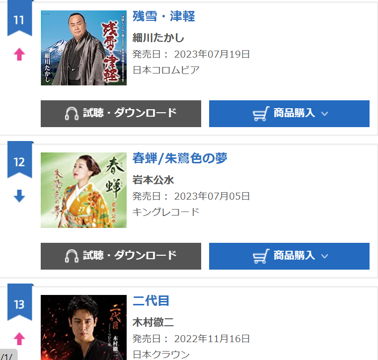 ORICON「週間 演歌・歌謡シングルランキング」で今週の2023年08月21日付(2023年08月07日〜2023年08月13日) にて7月19日発売の「細川たかし」さんの新曲